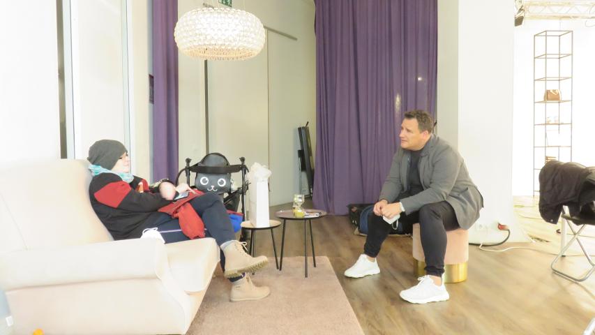 „Als wir sie zu Hause in Kaltenkirchen abgeholt haben, wartete sie schon an der Straße zusammen mit ihrer Freundin. Da sie genügend Schmerzmittel genommen hatte, konnte sie sitzend gefahren werden. Wir standen noch ordentlich im Stau, waren aber zeitig vor Ort. Im Studio wurden wir sehr nett von den beiden jungen Betreibern empfangen. Sie haben uns alles gezeigt, erklärt, wie so ein Dreh über die Bühne geht, und uns sämtliche freie Mitarbeiter vorgestellt.