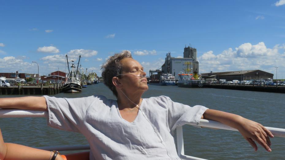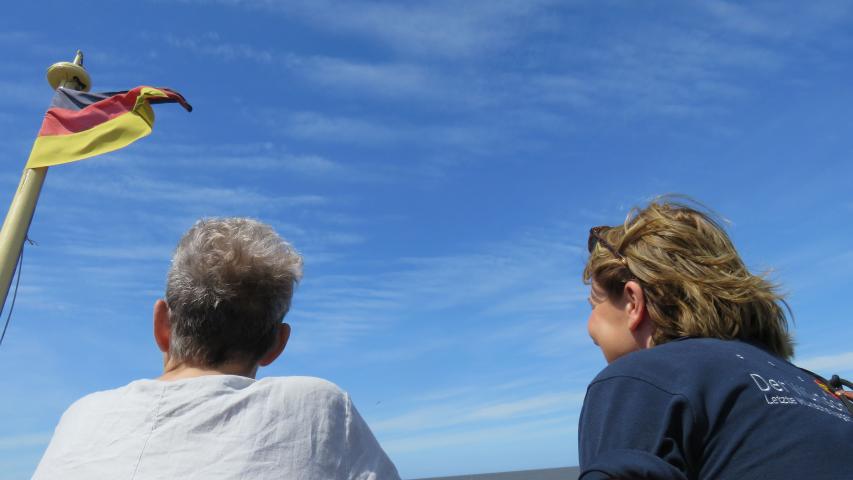 Die Crew der „Ol Büsum“ ist wunderbar und unterstützt uns sehr, wir dürfen als Erste und in aller Ruhe einsteigen. Gabi möchte direkt an der Reeling sitzen, wo ihr der Wind um die Nase pustet. Ich glaube, die Seehundbänke und die Tiere, die wir dort sehen, sind für sie fast nebensächlich, ihr Blick geht in die Ferne. Die kleineren Kinder sitzen ihr gegenüber, eingekuschelt in die Wünschewagen-Decke, die wir mitgebracht haben. Es gibt feste Umarmungen und Tränen, nicht bei Gabi, die total bei sich ist, sondern ihren Angehörigen, die fühlen, dass diese gemeinsame Zeit bald enden wird.
